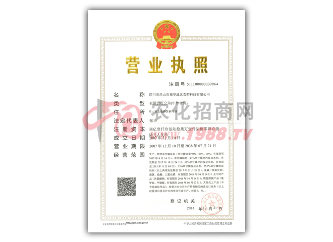 四川省樂山市福華通達農(nóng)藥科技有限公司坐落在的樂山大佛所在地--四川省樂山市,是國家農(nóng)藥定點生產(chǎn)企業(yè)之一。2014中國民營企業(yè)制造業(yè)500強排240位。公司現(xiàn)有員工2600余人,中高層管理人才90余名,各類專業(yè)技術(shù)人才235人,先后獲得國家發(fā)明、實用新型等各類專利40余項,并已在五大洲50多個國家和地區(qū)完成了農(nóng)藥產(chǎn)品登記。2014年實現(xiàn)產(chǎn)值107.52億元,出口創(chuàng)匯3.87億美元。
