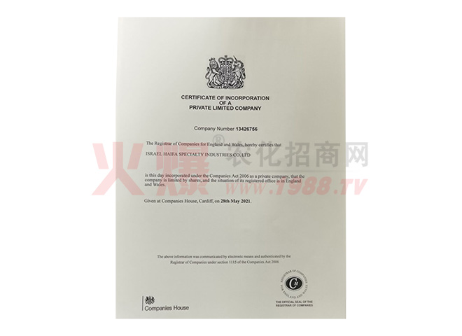 證書名稱:注冊信息 發(fā)證機構(gòu):以色列海法化學(xué)工業(yè)公司