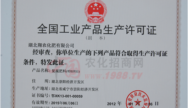 公司始建于1999年6月,為民營股份制企業(yè)。主要生產(chǎn)“翔農(nóng)”、“新生”、“崇豐”牌系列復(fù)合肥料。2006年3月,已取得國家頒發(fā)的高濃度《全國工業(yè)產(chǎn)品生產(chǎn)許可證》;同年10月,企業(yè)已通過GB/T19001-2008/ISO9001:2008質(zhì)量管理體系認證;2007年9月,被湖北省農(nóng)業(yè)廳認定為《湖北省測土配方肥料定點加工企業(yè)》;2009年5月,被咸寧市政府授予“咸寧市農(nóng)業(yè)產(chǎn)業(yè)化市級重點龍頭企業(yè)”的光榮稱號;同年11月,被咸寧市質(zhì)量興市領(lǐng)導(dǎo)小組辦公室授予“質(zhì)量監(jiān)督檢驗三年合格單位”。2011年12月,公司產(chǎn)品被湖北省實施質(zhì)量興省戰(zhàn)略工作領(lǐng)導(dǎo)小組授予“湖北產(chǎn)品”。2012年9月,“翔農(nóng)”商標榮獲湖北省著名商標。