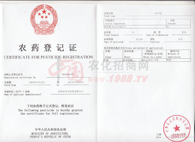 • 氟鈴脲農(nóng)藥登記證氟鈴脲農(nóng)藥登記證