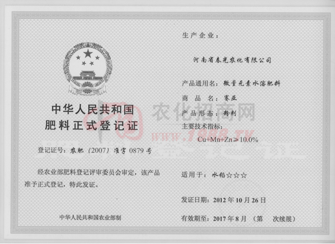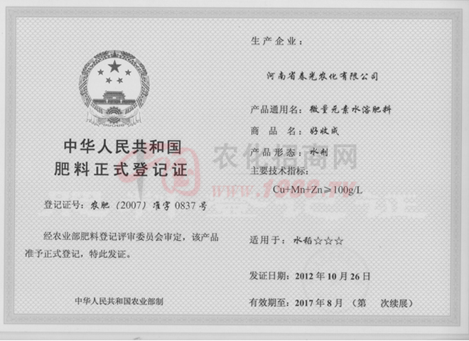 • 好收成肥料正式登記證好收成肥料正式登記證