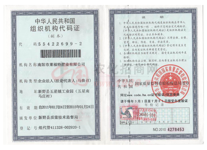 證書名稱:組織機構代碼證 發(fā)證機構:新野縣質(zhì)量技術監(jiān)督局