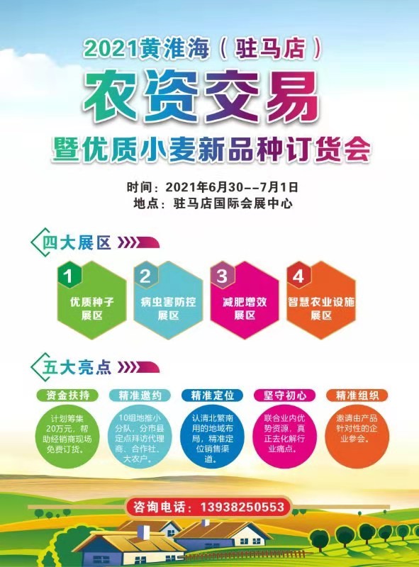 為促進(jìn)我省小麥種子北繁南用,加快我省花生品種推廣、普及高效綠色防控成果,促進(jìn)一二三產(chǎn)業(yè)融合發(fā)展,提升我省農(nóng)業(yè)品牌。2021黃淮海(駐馬店)農(nóng)資交易暨優(yōu)質(zhì)小麥品種展覽會(huì)、2021第二屆河南花生產(chǎn)業(yè)信息交流暨品牌農(nóng)資農(nóng)機(jī)展覽會(huì)將于6月29日到7月1日在駐馬店國際會(huì)展中心舉辦。