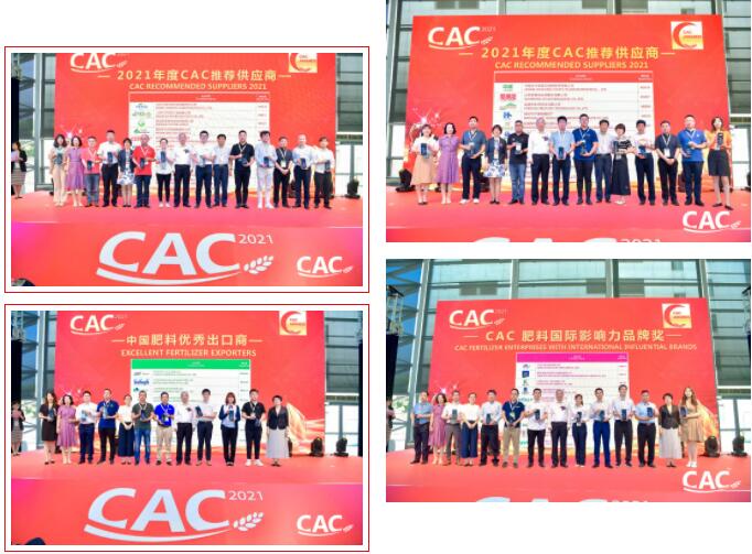 第九屆CAC獎(jiǎng)?lì)C獎(jiǎng)典禮于6月22日下午2:00在上海新國(guó)際博覽中心3號(hào)入口廳隆重舉辦。頒獎(jiǎng)典禮上隆重揭曉了肥料優(yōu)質(zhì)出口商、CAC肥料國(guó)際影響力品牌獎(jiǎng)、2020海外市場(chǎng)拓展獎(jiǎng)、2021年度CAC推薦供應(yīng)商的獲獎(jiǎng)名單,46家肥料企業(yè)喜獲獎(jiǎng)杯。